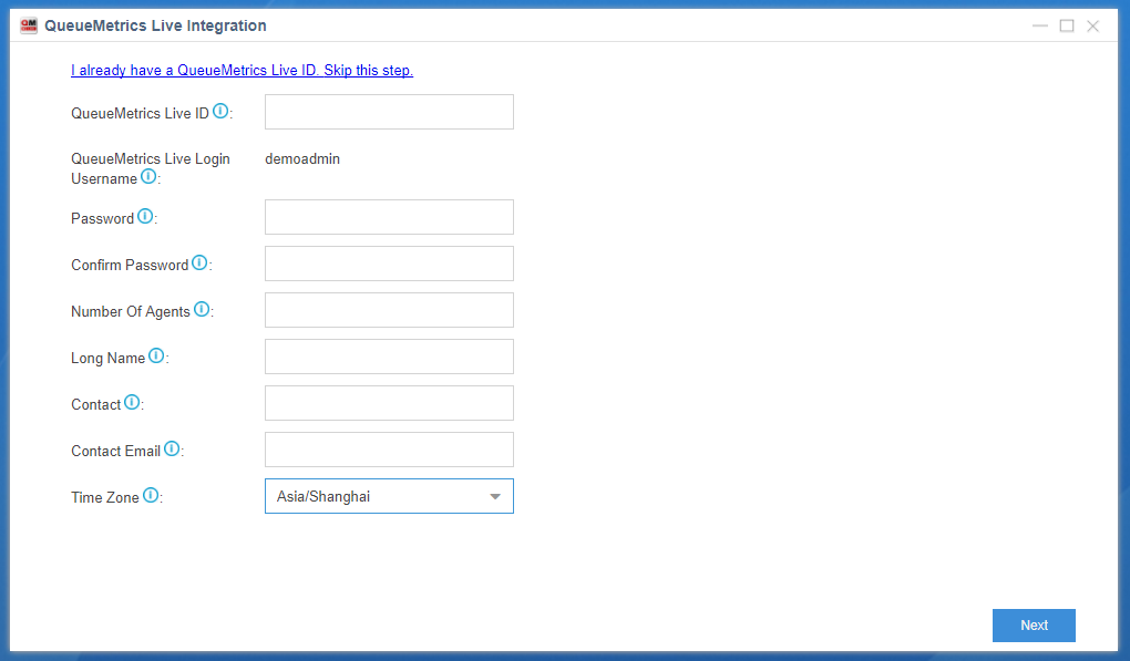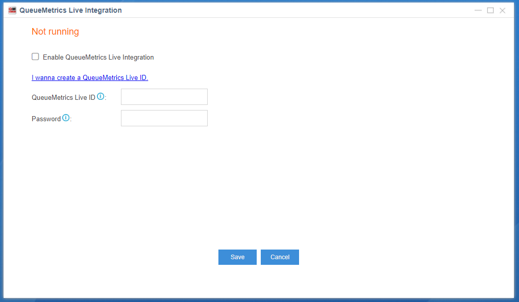 5) The first time you start the application you will be requested the QueueMetrics-Live ID and password. If you do not own it click on "I wanna create a QueueMetrics Live ID".